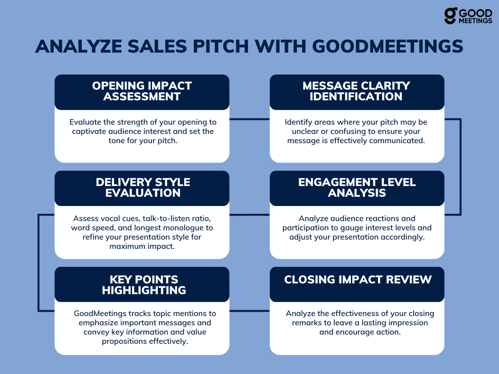 Now, if you want to analyze and enhance your sales pitch, GoodMeetings can help. It goes beyond typical meeting analytics by allowing you to analyze sales pitches and make them more effective for closing deals.