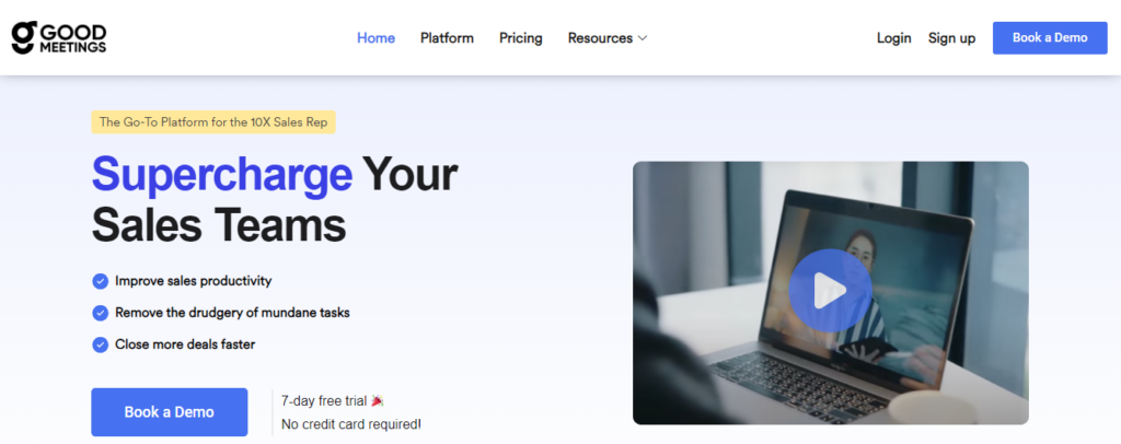 And, that’s precisely where Goodmeetings can help you. It captures meeting insights through call recordings, transcriptions, and analytics, empowering teams to close deals faster. Goodmeetings analyzes sales conversations to measure and improve sales rep performance, identify trends, evaluate meeting effectiveness, and optimize sales processes.