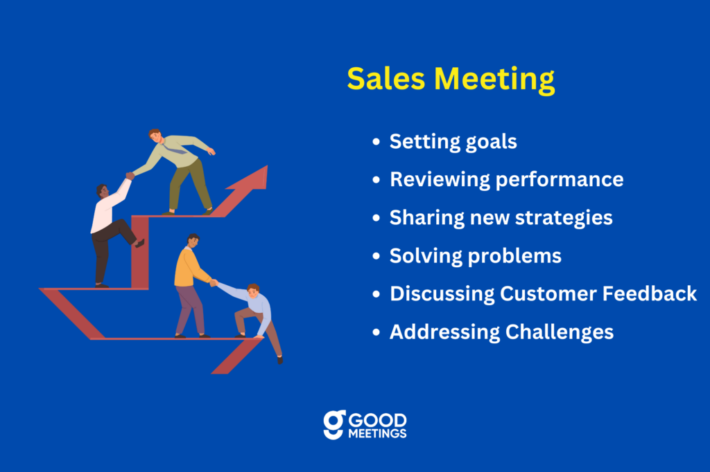 - Team Meetings: These are regular gatherings where the entire sales team meets. The purpose is to discuss updates, share information, and align on goals.