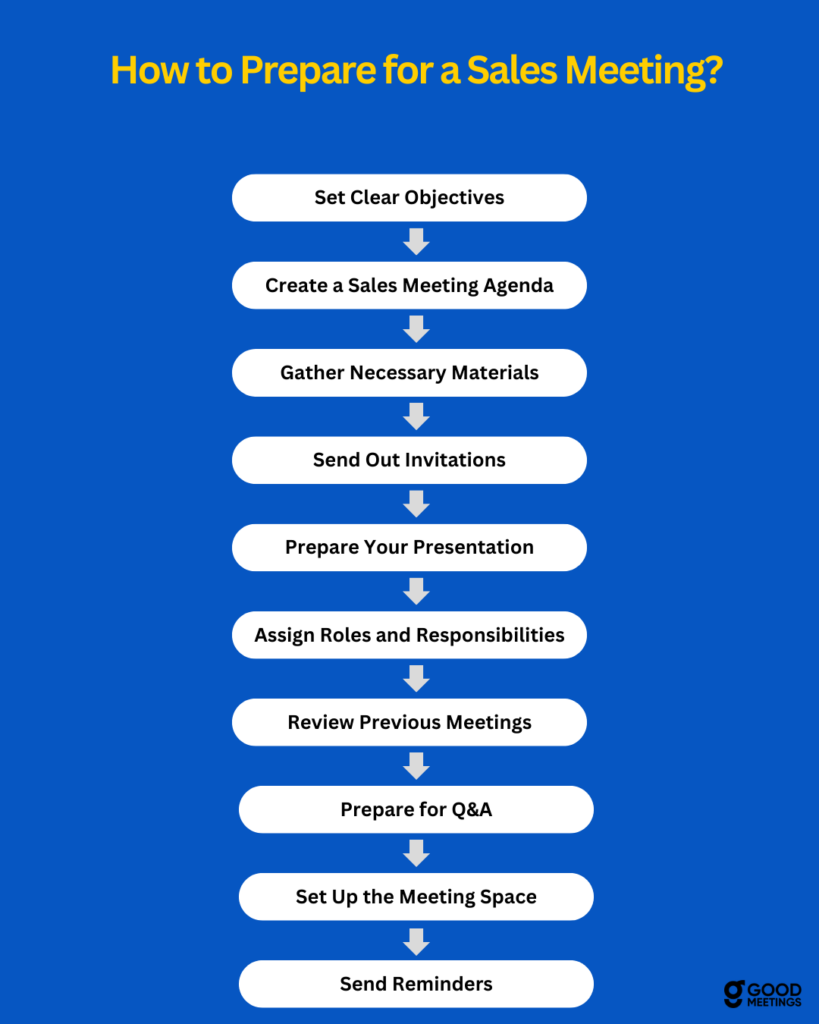 Preparing for a sales meeting requires careful planning and attention to detail. Follow these steps to ensure your meeting is productive and effective: