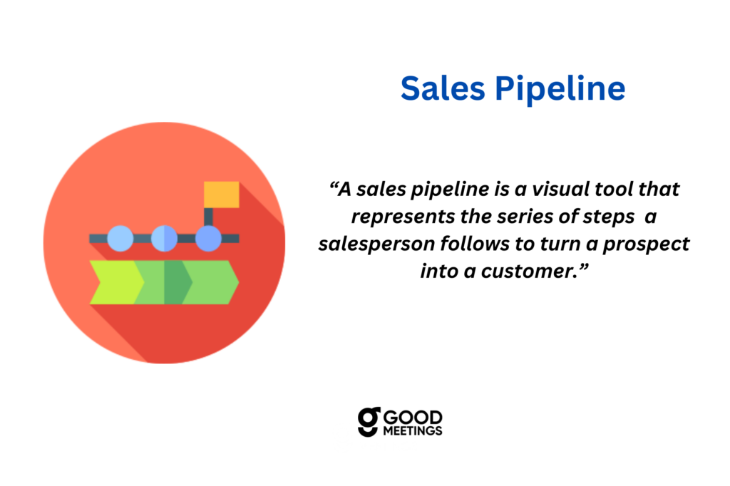 A sales pipeline is a visual tool that represents the series of steps a salesperson follows to turn a prospect into a customer. It shows each stage of the sales process, from initial contact to closing the deal, helping sales teams track progress and identify where prospects are in their buying journey.