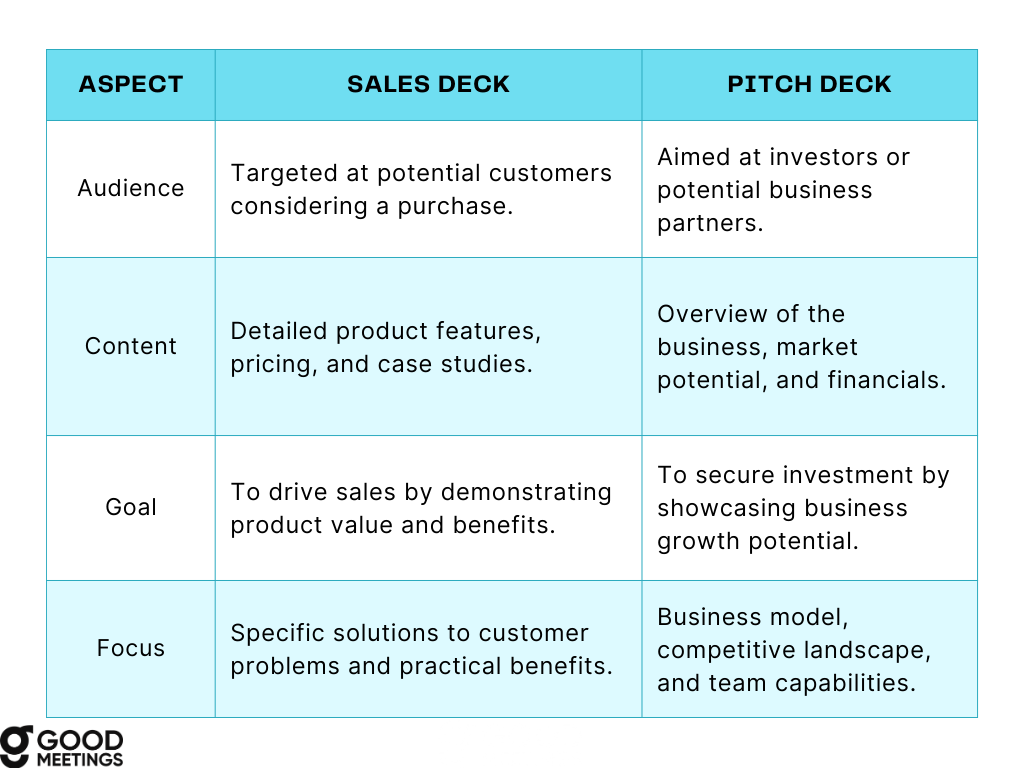A sales deck is specifically designed for direct sales presentations. Its primary focus is on converting potential clients or leads into customers.
