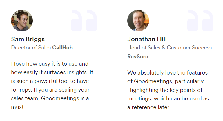 Goodmeetings is an AI-powered tool that helps you record, transcribe, summarize and analyze all the sales meetings and conversations – thereby giving you important data that helps to close deals faster. With Goodmeetings you can –