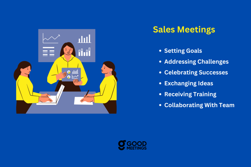Sales meetings are gatherings where sales teams come together to discuss strategies, review performance, and share updates. These meetings can be held regularly, such as weekly or monthly, and serve as a platform for,