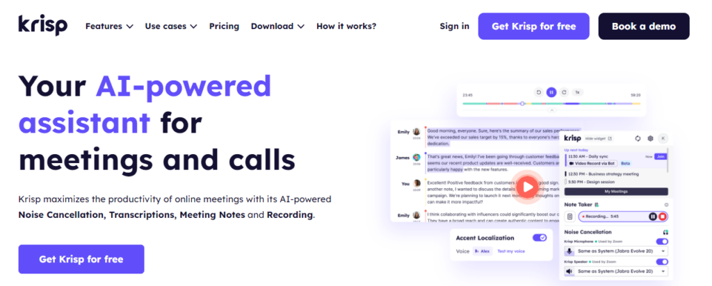 Krisp is a smart meeting assistant app that transforms virtual meetings with its array of features, including noise and echo cancellation, automatic transcriptions, AI-generated meeting notes, and high-quality audio recordings. Using advanced AI, Krisp ensures crystal-clear audio, creating more productive and focused virtual interactions.