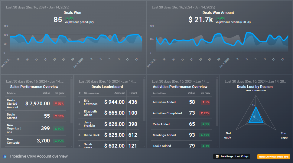 The Pipedrive CRM Account Overview Dashboard offers a clear view of sales activities, deal progress, and team performance. It helps track won and lost deals, pipeline stages, and sales rep productivity.