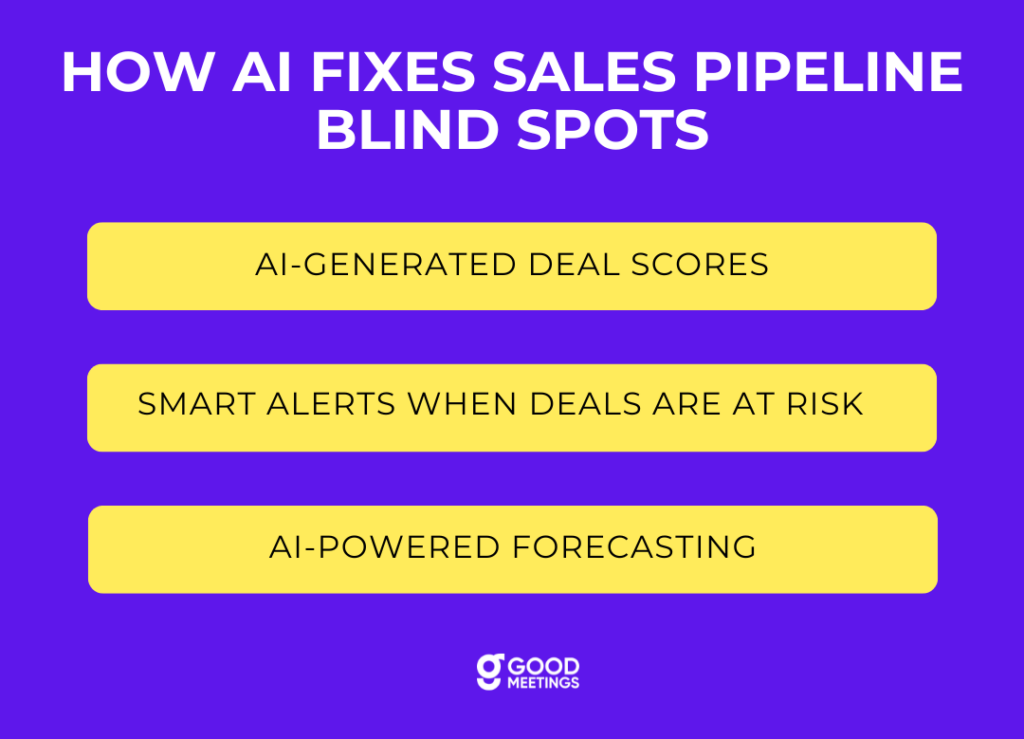AI reveals the real picture. It analyzes win/loss ratios and sentiment trends to show which deals are solid and which are just false hope. For example, adding Goodmeetings (an AI-powered tool) to your sales kit can boost your win/loss prediction accuracy by 45%.