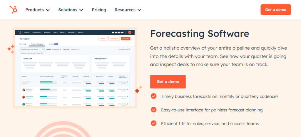 - Pipeline Forecasting: Analyzes the current sales pipeline to predict future sales. It considers the number and stage of deals in progress, helping estimate the likelihood of closing each deal.