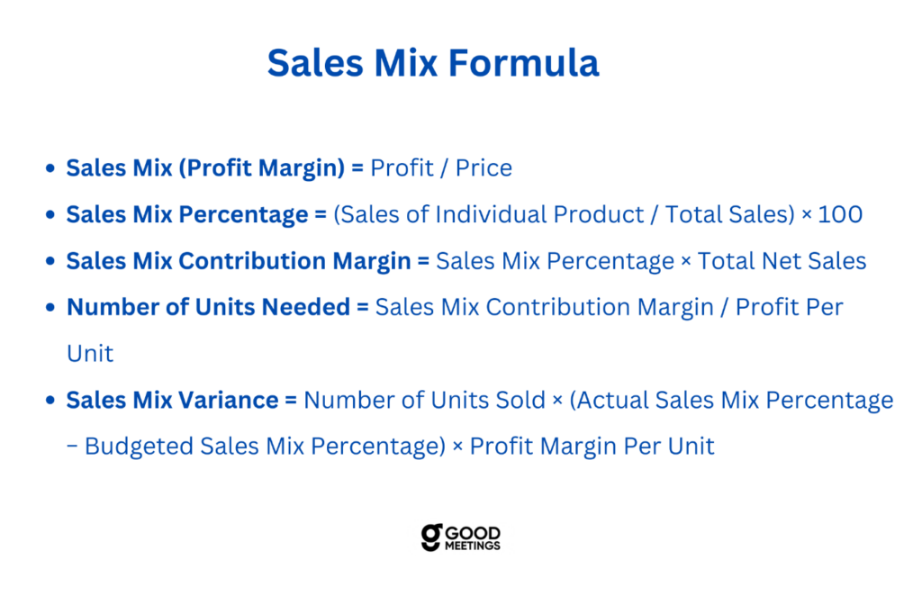 You can also express the sales mix as a ratio. For example, if Product A accounts for 25% of total sales and Product B accounts for 75%, the sales mix ratio is 1:3.